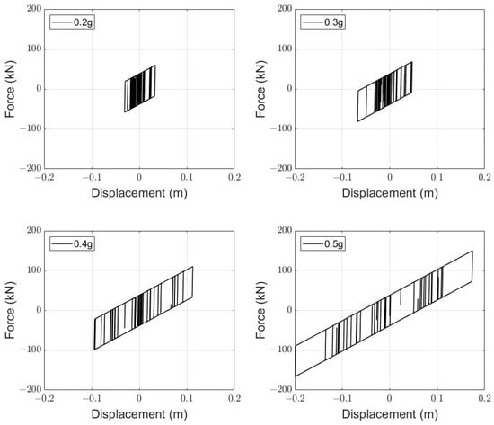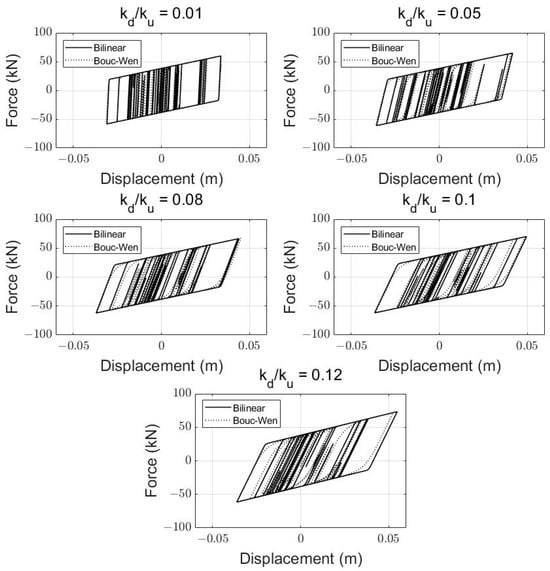 As explained previously, isolated structures behave nonlinearly, and the ISRS can be affected depending on the hysteresis behavior of the isolator. The nonlinear effect will be increased by the seismic intensity increase. When the seismic intensity is larger, the maximum displacement increases and the effective stiffness decreases, which increases the effective period and affects the low-frequency response. Conversely, when the intensity decreases, the maximum displacement decreases, which can affect the high-frequency response. Therefore, it is necessary to examine all seismic intensities under the design level intensity. Isakovic et al. [13] analyzed the acceleration floor response of an isolated structure with high damping lead bearings by applying a seismic intensity weaker than the design intensity. Despite the weak seismic intensity, the effective stiffness of HDRB had increased significantly, shifting the resonance range, which may result in acceleration not decreasing or even increasing. Another variable considered in this study is the sharpness of the yield point of the hysteresis model. The hysteresis behavior varies depending on the bearing model and can be designed with a bilinear model and a Bouc–Wen model, as shown in Figure 5. Although the design is based on the bilinear model, the actual isolated structure behaves in a smoothed curve like the Bouc–Wen model. Although many studies have been conducted on the Bouc–Wen model and its mechanical properties have been verified, it is necessary to investigate how the differences in yield points due to the sharpness of the yield point affect the ISRS.