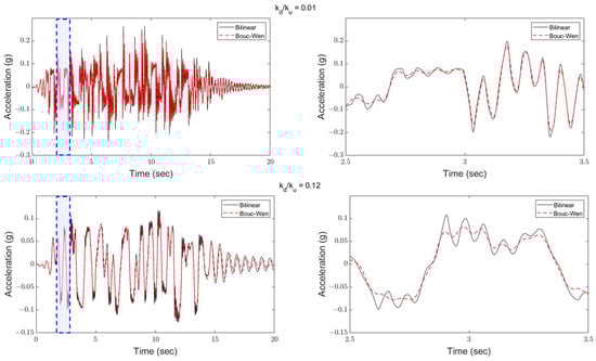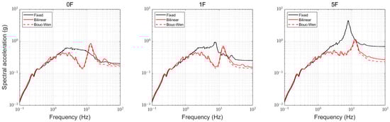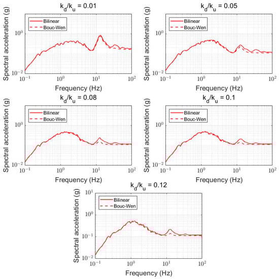 All the preceding results were the ISRS with an isolator of a bilinear hysteresis model. Because the realistic hysteresis behavior has a smooth curve at the yield point like the Bouc–Wen model, the effects on the ISRS by the sharpness of the yield point were examined. Figure 19 is the ISRS in which a 0.2 g input motion was input to an isolated structure with the same stiffness ratio of 0.01 and different sharpness of the yield point. In the case of high initial stiffness, there was a slight difference at high frequencies that were greater than the structural frequency, but it did not have a significant effect overall. Looking at the hysteresis behavior corresponding to the stiffness ratio of 0.01 in Figure 20, there was almost no difference between the two models, but the smaller the initial stiffness, the more apparent the difference. In the bilinear model, the stiffness before and after yielding changes rapidly, whereas in the Bouc–Wen model, the stiffness changes gradually and forms a smooth curve. Therefore, the smaller the initial stiffness, the larger the difference in the sharpness of yield point is thought to be. This difference affects the second (approximately 13 Hz) and third mode (approximately 33 Hz) frequencies of the isolated structure, which are the first and second structural mode frequencies, respectively, in the ISRS (Figure 21). When the initial stiffness was very large, the response of the bilinear model occurred larger in the modal frequency except for the isolation frequency. The Bouc–Wen model showed a peak only at the second mode frequency of the isolated structure and did not show a large response at higher modal frequencies. As the initial stiffness decreased, the response at higher modal frequencies decreased in both models, but the response of the Bouc–Wen model decreased more significantly. Because the stiffness of the Bouc–Wen model gradually changes, it appears that the response decreases at the structural frequency. That is, it was confirmed that the sharpness of the yield point was related to the initial stiffness of the isolator and had a significant influence on the high-frequency range. Figure 22 is a graph comparing the acceleration time history on the 5F according to the hysteresis model for stiffness ratios of 0.01 and 0.12. The acceleration response of the Bouc–Wen model was small overall, and the 2.5 to 3.5 s range was zoomed and displayed next to the time history graph to see the response in the high-frequency range. It was confirmed that the response of the Bouc–Wen model decreased in the range with many high frequency contents and the cycle lengthened. Therefore, if the design ISRS is designed to be based on the ideal bilinear model, there can be an overestimation in the high-frequency range. If the design ISRS development requires consideration of the high-order mode response, the bilinear model would be appropriate. However, if not, it may be appropriate to evaluate it with the Bouc–Wen model.