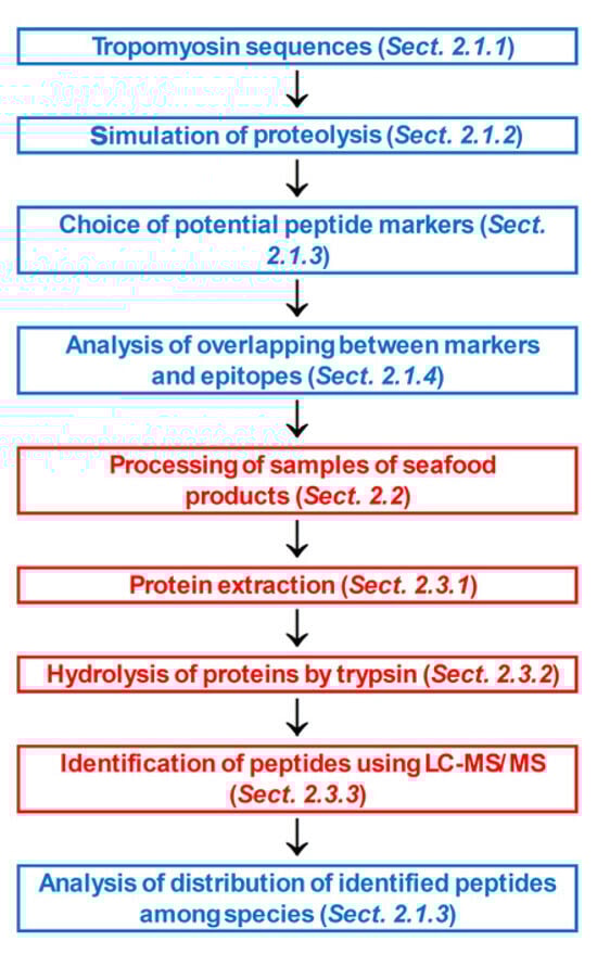 The present study results indicate that the presence of common fragments containing epitopes in tropomyosins may be helpful in identifying allergens from crustaceans and mollusks in seafoods via other methods, such as immunochemical assays or PCR. Such methods have been recently developed and deployed in several experiments [80,81,82,83,84,85,86] and are also viable for peptides resulting from the hydrolysis of the boiled products and containing entire epitopes within their sequences.