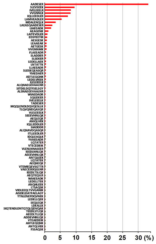 Distribution of the peptides chosen as markers of allergenic tropomyosins among proteins belonging to this family (defined according to IntePro database) is presented in Figure 2. There was one peptide among the 76 compounds resulting from in silico proteolysis: AADESER occurring in over 30% of tropomyosins, five peptides found in 5–30% of tropomyosins and four found in 1–5% of tropomyosins.