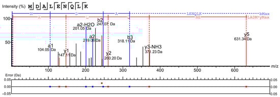 An example of the MS/MS spectrum of an identified peptide (with the MDALENQLK sequence) is provided in Figure 3. Chromatograms of protein extracts and their hydrolysates are included in the Supplementary Materials in Figures S7–S20. Mass spectra contain typical ions resulting from the fragmentation of peptide bonds and products of water or ammonia release from them (neutral loss) [57,58]. Modifications of amino acid residues in individual peptides (oxidation, deamidation, etc. are summarized in Table S3 in the Supplementary Materials). The length of peptides varied from 7 to 41 amino acid residues. Spectra of the two longest peptides detected during the experiment (34 and 41 amino acid residues) are shown in Figures S7 and S8 in the Supplementary Materials. Contemporary proteomic and peptidomic studies involve the detection of long peptides (with length exceeding 20–25 amino acid residues) [59,60,61].