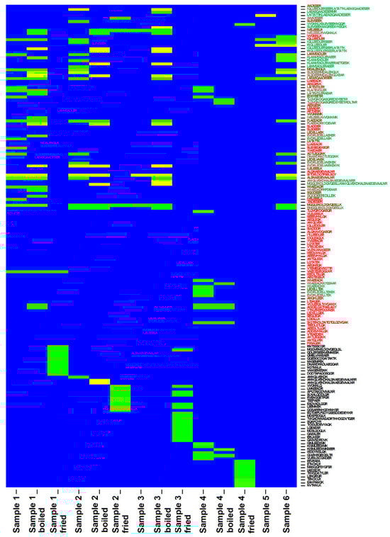 The results provided in Figure 5 show similarity between peptide sets obtained from raw and boiled samples, while showing that they differ from those identified in the fried samples. Differences between the fried samples and the raw samples are in agreement with the results reported by Xu et al. [19]. Sets of peptides are also sensitive to sample preparation protocols [65]. Noteworthy is the lack of similarity between sample 4 containing mollusk tropomyosin and other samples containing crustacean tropomyosins. Similarity between peptide sets obtained from raw and boiled samples 1 and 4 could be expected due to the fact that both contained Chilean mussel (Mytilus chilensis).