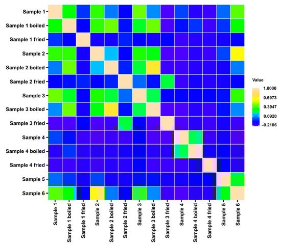 Correlation matrix between sets of peptides identified in the hydrolysates of individual samples. Only peptides detected in at least one sample were considered (108 peptides). Yellow—strong or moderate correlation, green—weak correlation, blue—no correlation. Correlation coefficients are provided in Table S7 in the Supplementary Materials. Correlation matrix was generated using HeatMapper program.