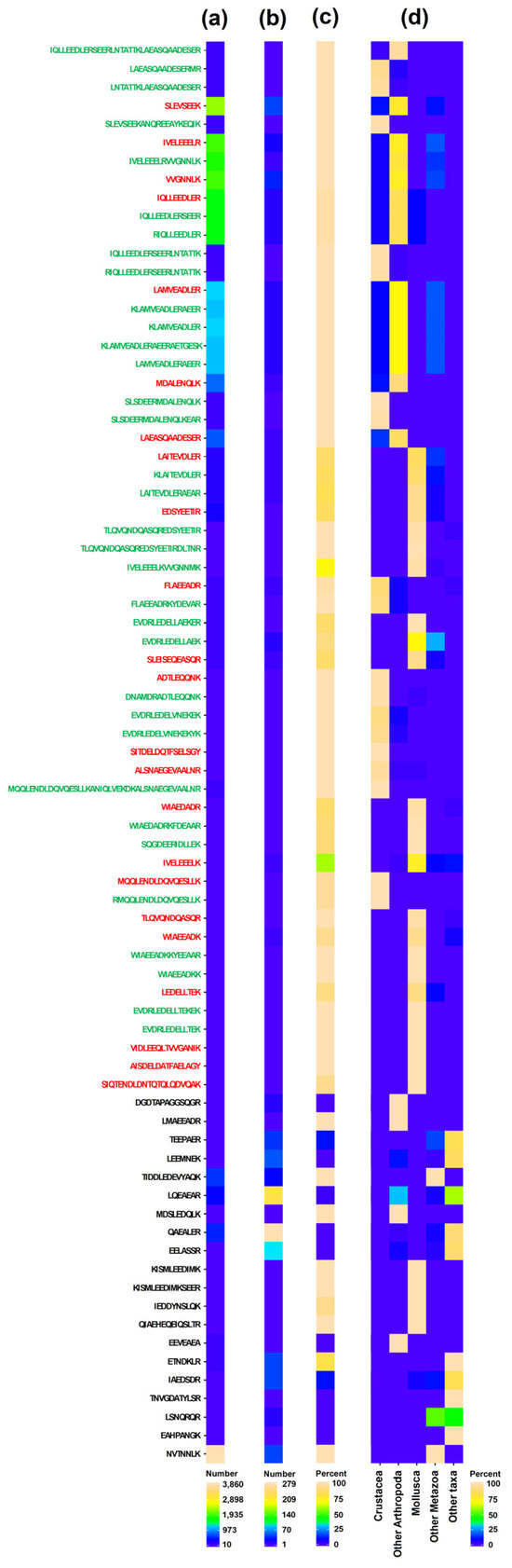 Distribution of peptides identified in seafood samples and present in at least 10 parent proteins determined using the Unipept program. The number of all proteins containing a given peptide is taken as 100%. (a) Number of proteins containing a given peptide; (b) number of InterPro families containing a given peptide; (c) percentage of tropomyosins among proteins containing a given peptide; (d) percentage of proteins of organisms belonging to various taxa among the ones containing a given peptide. Heatmaps generated using HeatMapper program. Raw data are annotated in Table S8 in the Supplementary Materials. Meaning of font colors is the same as in Figure 4.