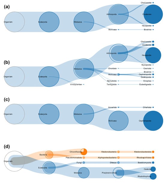 Taxonomic lineage trees of peptides: (a) LAEASQAADESERMR as an example of peptide characteristic for Crustacea; (b) IQLLEEDLER as an example of peptide characteristic for Arthropoda; (c) IVELEEELKVVGNNMK as an example of peptide characteristic for Mollusca; (d) LSNQRQR as an example of peptide with inconclusive taxonomic lineage. Trees were generated using the Unipept program.