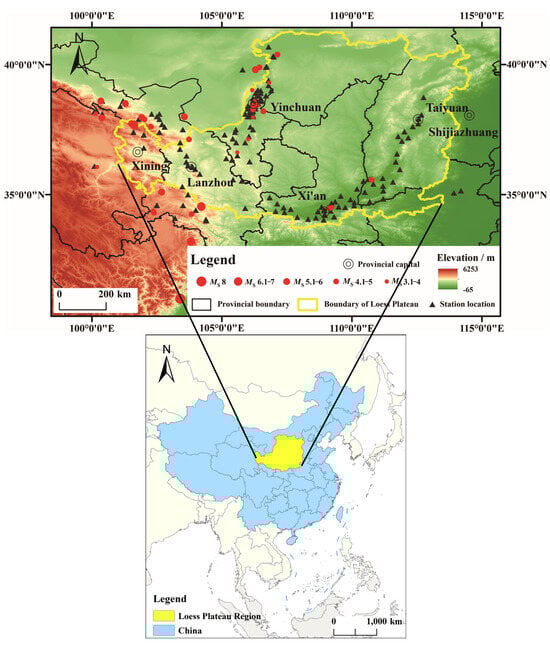Schematic map of the earthquake magnitude and epicenter and the locations of the strongest stations in the Loess Plateau region of China.