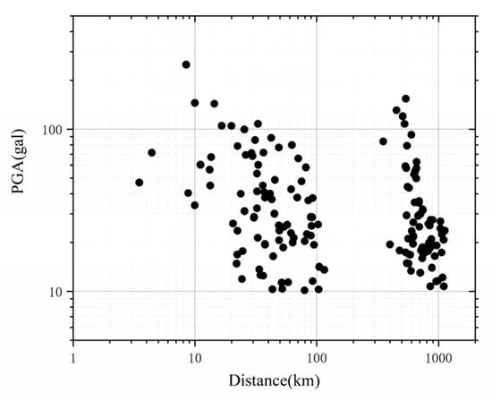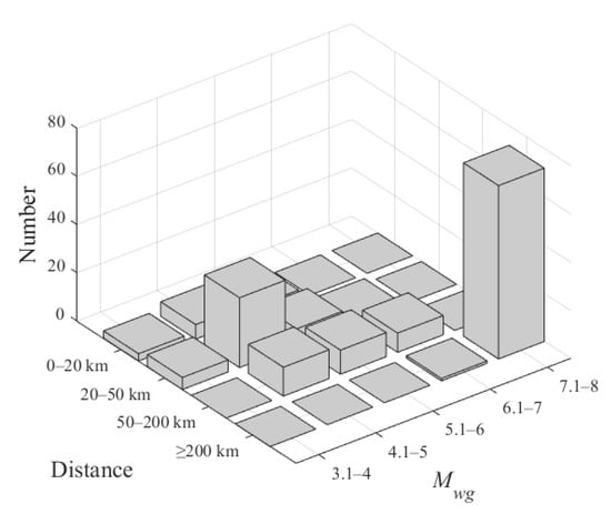 For magnitude-based analysis, the seismic moment magnitude scale (Mwg) was adopted due to its advantages over the traditional MS scale [32]. The Mwg values were calculated using the GOR1 method, as described in Equation (1). This method incorporates factors such as the earthquake’s energy release and fault characteristics, providing a more accurate assessment of earthquake size and a comprehensive representation of the event’s overall strength [33]. Using this approach, the converted Mwg magnitudes ranged from 3.9 to 7.9. The relationships between magnitude and epicentral distance, as well as PGA and epicentral distance, are shown in Figure 2 and Figure 3, respectively.