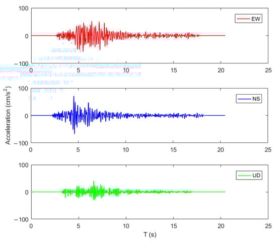 (1) Baseline Correction: The polynomial fitting method [34] was applied to correct the baseline of the strong-motion records in the EW, NS, and UD directions individually in order to eliminate baseline drift effects.