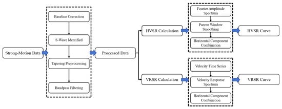 To meet the requirements for calculating HVSR and VRSR, the selected 477 strong-motion records were processed using the following four steps.