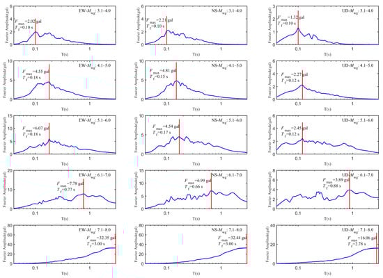 The selected strong-motion records were categorized into five magnitude (Mwg) ranges: 3.1–4.0, 4.1–5.0, 5.1–6.0, 6.1–7.0, and 7.1–8.0. For each range, the Fourier amplitude spectra of the EW, NS, and UD components were computed, and the average Fourier amplitude spectrum for each component was determined. The mean Fourier amplitude spectral curves are shown in Figure 7, and the maximum value of the mean curve (Fmax) and the predominant period (Tf) for each group are presented in Table 1.