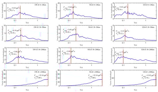The epicentral distances (R) were grouped into four ranges: 0–20 km, 20–50 km, 50–200 km, and ≥200 km. For each group, the Fourier amplitude spectra of the EW, NS, and UD components were calculated, and the mean values of the Fourier amplitude spectra for all components were obtained. The mean Fourier amplitude spectral curves are shown in Figure 8. The results of Fmax and Tf across different ranges of epicentral distance are listed in Table 2.