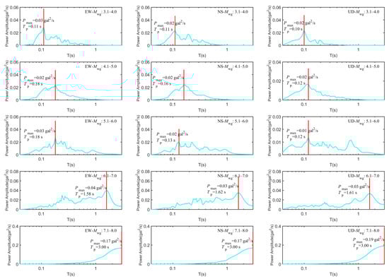Figure 10 and Table 4 indicate that, on average, the power spectra of the three components are notably influenced by the earthquake magnitude. As the magnitude increases, both Pmax and Tp exhibit a distinct upward trend. Within the same magnitude range, except for the 7.1–8.0 group, the Pmax and Tp values of the horizontal components are not significantly different from those of the vertical components.