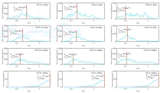 Based on the epicentral distance groupings in Section 4.1.2, the power spectra for the EW, NS, and UD components were calculated for each group. The mean power spectral curves are shown in Figure 10. The Pmax and Tp results for each epicentral distance range are summarized in Table 4.
