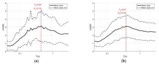 The velocity response spectrum with a 5% damping ratio was directly calculated from the processed acceleration time history. The VRSR was calculated according to Equation (7), which represents the ratio of the horizontal to the vertical velocity response spectra. The horizontal velocity response spectrum was obtained by calculating the geometric mean of the velocity response spectra in the EW and NS directions.