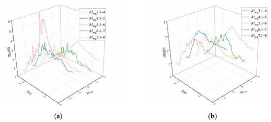 As shown in Figure 9 and Table 3, the power spectra of the three components are significantly influenced by the earthquake magnitude. On average, as the magnitude increases, both Pmax and Tp display a clear upward trend. Within the same magnitude range, there is generally not a significant difference between Pmax and Tp for the horizontal and vertical directions, except in the 7.1–8.0 magnitude subgroup.