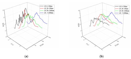 Using the distribution of strong-motion records and the epicentral distance groupings from Section 4.1.2, the mean HVSR versus epicentral distance curve and the mean VRSR versus epicentral distance curve were computed for each group, as shown in Figure 13a,b. The corresponding A0 and T0 values derived from these mean curves for the different epicentral distance groupings are presented in Table 6.
