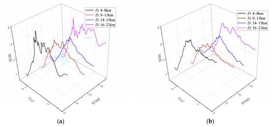 Focal depths were classified into four ranges, namely, 4–8 km, 9–13 km, 14–15 km, and 16–21 km, according to the distribution of strong-motion records. The mean HVSR and VRSR curves for each range plotted against the focal depth are shown in Figure 14a,b. The A0 and T0 values derived from these curves for the different focal depth groupings are presented in Table 7.