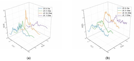 Loess thickness (H) was determined from borehole logs collected during site surveys at strong-motion observation stations. Among the stations selected, 53 were found to have loess coverage, with thicknesses ranging from 0.4 m to 50.1 m. The loess thicknesses were grouped into four categories: 0–5 m, 5–10 m, 10–20 m, and ≥20 m. The mean HVSR and VRSR curves for each group plotted against the loess thickness are presented in Figure 15a,b. The A0 and T0 values derived from these mean curves for various loess thicknesses are provided in Table 8.