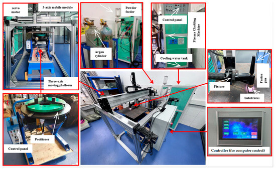 The experiment was conducted using argon as the protective gas, with the powder feeding gas, ion gas, and protective gas flow rates set to 3.5 L/min, 1.5 L/min, and 10 L/min, respectively. The longitudinal displacement was 2 mm. The experimental setup is illustrated in Figure 1.