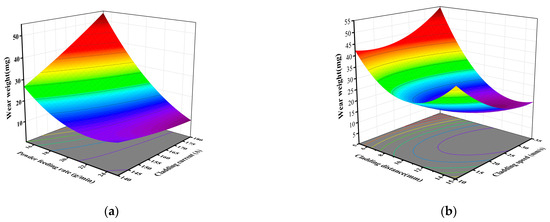 Three-dimensional response surface; (a) response surface plot of the powder feed rate and cladding current; (b) response surface plot of cladding distance and cladding speed. Different colors represent varying degrees of wear, indicating the severity of wear, with red denoting the most severe wear and purple representing the least severe. The lines of different colors below indicate projections of various levels of wear.