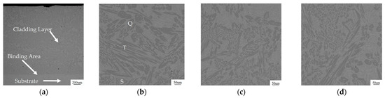 Figure 3 presents the SEM microstructure of the plasma cladding layer, revealing no apparent porosity, cracks, or other impurities and indicating a clean interface. A distinct transition zone exists between the cladding layer and the substrate, which is attributed to elemental diffusion, resulting in a robust metallurgical bond. The SEM image shows that the cladding layer primarily consists of a light gray matrix phase and a dark gray hard phase. The hard phase exhibits various morphologies, which are mainly categorized into three types: needle-like T, hexagonal Q, and cellular S structures in triangular regions. Throughout the cladding layer, the growth direction of the hard phase is predominantly vertical or inclined upwards, providing support to the cladding layer and effectively resisting surface wear [27]. The size of the hard phase within the cladding layer varies; it is larger at the bottom, finer in the middle, and increasing again at the top. This variation is a result of the rapid heating and cooling characteristics of the plasma-cladding process, which influence the crystallization of the hard phase [28].