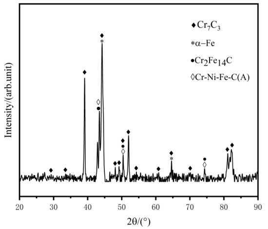 Figure 4 presents the X-ray diffraction (XRD) pattern of the cladding layer, revealing that the primary phases consist of α-Fe, Cr7C3, Cr2Fe14C, and Cr-Ni-Fe-C solid solutions. In the XRD pattern, the higher the relative peak intensity of a particular phase, the greater its content [29]. It can be observed that Cr7C3 is the predominant hard phase in this cladding layer, with the highest proportion.