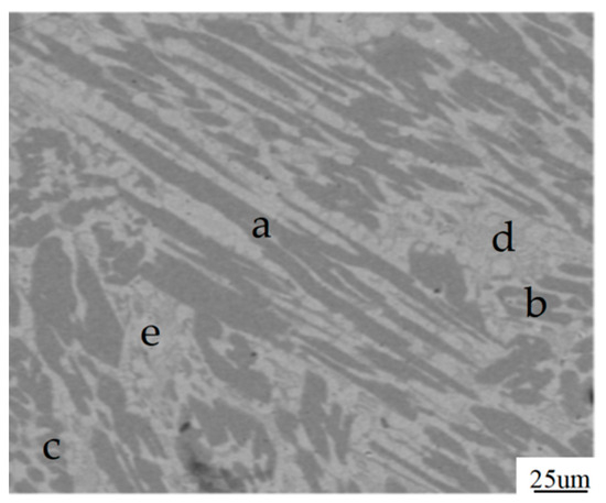 Table 6 presents an energy spectrum analysis of the points in Figure 5. The analysis reveals that the elemental compositions of points a, b, and c are nearly identical, indicating that they belong to the same class of material. The atomic ratio of Cr to C is greater than 2.3, suggesting the presence of not only the Cr7C3 phase but also, based on the XRD results, a minor amount of the iron–chromium compound Cr2Fe14C. Despite having the same chemical composition, the shapes of these points vary due to the poor directional growth of the hard phase. Observations from different angles reveal different cross-sections, and the significant differences in shape are attributed to variations in crystallization methods [30,31].