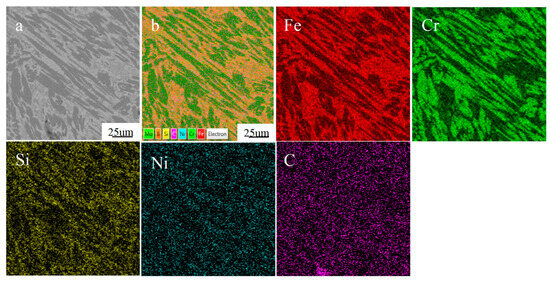 Figure 6 presents the elemental distribution map of the cladding layer. Analysis of the figure reveals that Cr is predominantly concentrated in the hard phases, and it exhibits needle-like, hexagonal, and triangular cellular aggregation zones, existing primarily in the forms of Cr7C3 and Cr2Fe14C. These compounds provide excellent wear resistance to the cladding layer. C, on the other hand, is dispersed throughout both the hard phases and the matrix phase. The distribution areas of Si and Ni are largely similar to those of Fe, as they are present in the matrix phase as compounds and solid solutions. The microstructures formed by these elements contribute to maintaining a certain level of toughness in the cladding layer, thereby enhancing its overall mechanical properties.