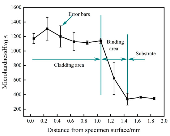 The micro-Vickers hardness of the cladding layer was measured using an HV-1000Z micro-Vickers hardness tester, with a loading force of 0.5 kg and a loading time of 5 s. Testing began at a distance of 50 nm from the surface, and one point was tested every 200 nm. To reduce measurement error, the average value of three points at the same depth was taken.