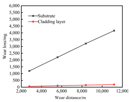 The wear of materials depends on the properties of their surfaces, such as their roughness and hardness [34]. Figure 7 shows the cross-sectional microhardness variation of the Fe5 cladding layer under optimal parameters. Analysis of the figure indicates that the overall hardness of the cladding zone is significantly higher than that of the substrate. Higher hardness can reduce the severity of wear, and there exists a gradual transition zone between the two, which can prevent the coating from peeling off under stress [18,35]. The average hardness of the cladding layer is 1171 Hv0.5, approximately 2.9 times that of the substrate. This higher hardness can better resist wear and extend the service life.