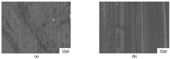 (a) Microstructure of the wear track for the samples observed by SEM: (a) with an Fe5 coating; (b) without the coating.