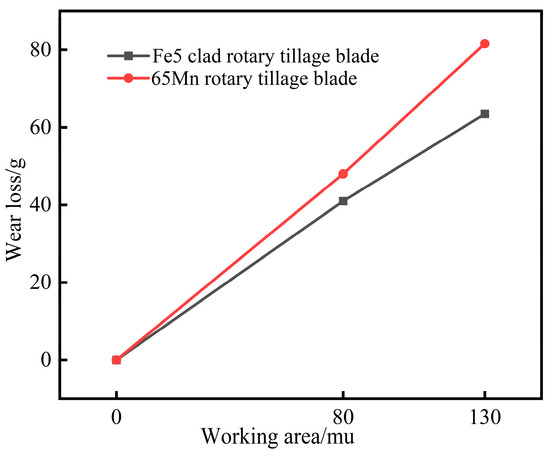 Wear loss curves of the 65Mn rotary tillage blade and the blade with the plasma-cladding Fe5 coatings in the field test.