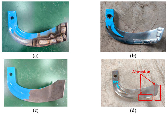 The morphology of rotary tillage blades with and without Fe5 coatings (a) pre-test rotary tillage blades with Fe5 coating; (b) post-test rotary tillage blades with Fe5 coating; (c) pre-test rotary tillage blades without Fe5 coating; (d) post-test rotary tillage blades without Fe5 coating. The red portion indicates the area of the rotary tiller blade that has experienced wear.