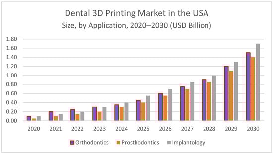 Recently, thanks to gaining significant popularity, AM also grew in market value and in areas of applications. The Wohlers Report 2024 shows that the AM and 3D printing industry grew by 11.1% in 2023, pushing the industry’s market value beyond USD 20 billion. Improvements in printer speed and reductions in material costs are expected to lower production costs. This may expand the use of AM for high-volume production and make 3D printing more economical. Three-dimensional printing spread into all industrial sectors, with dentistry and medicine covering 16% of the total volume [,]. According to the Grand View Report, in 2023, orthodontics held the largest share of the dental 3D printing market, accounting for 39% of the revenue. As described in Figure 1, the demand in this segment is expected to continue growing significantly, highlighting its critical role in driving advancements in dental 3D printing technologies, even though implantology might potentially surpass orthodontics in total market share in the next years.