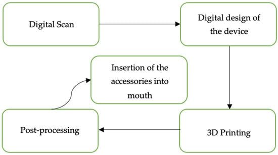 These technological advancements allowed healthcare professionals to offer more personalized medical devices to each patient. Three-dimensionally printed appliances are crafted specifically for an individual’s anatomy, utilizing imaging data and 3D models to design and manufacture medical appliances []. The manufacturing workflow for customized 3D-printed orthodontic accessories is illustrated in Figure 2.