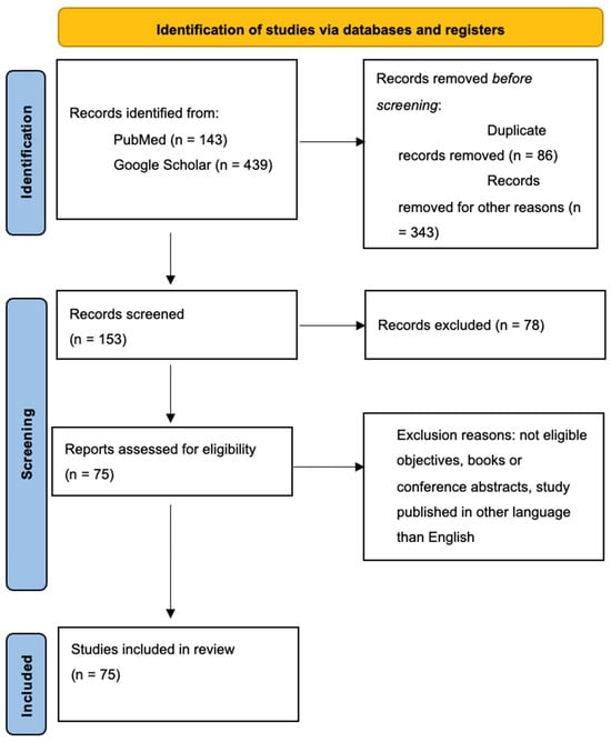 A detailed assessment of abstracts and, where necessary, full texts was then performed to exclude studies focused on aspects outside the intended scope. This refined the selection to a final count of 75 articles based on their relevance to the focus of this review, which includes advancements in 3D printing technologies in orthodontics and their application in the design and manufacturing of orthodontic accessories and appliances for intraoral use. Out of the 75 articles included in the review, 25 original articles were retrieved from PubMed and 17 were identified through Google Scholar. The remaining articles were found to overlap across both databases, demonstrating the complementary nature of these search tools in capturing the relevant literature. Figure 3 provides a detailed overview of the study selection process conducted for this review.
