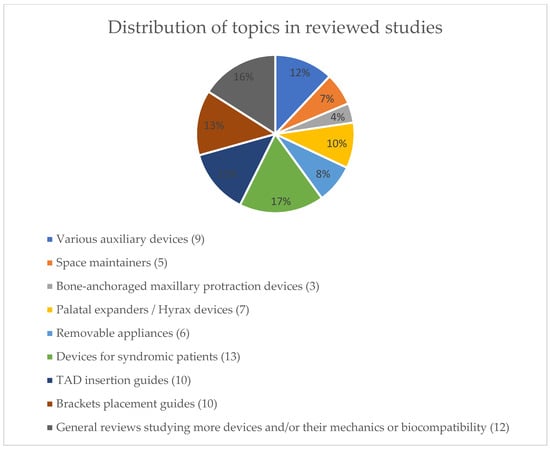 Two of the authors (M.P., J.T.) screened all of the identified articles against the inclusion criteria, resolving discrepancies through discussion. No automation tools were employed in this process. In this review, articles were included based on their direct relevance to orthodontics, focusing specifically on the design and use of 3D-printed accessories for orthodontic purposes. Studies that primarily addressed applications of 3D printing outside of orthodontics were excluded to maintain a targeted scope. Additionally, articles focusing on anatomic models, directly printed brackets, directly printed or thermoformed aligners, and retainers were not included. This decision was made to narrow the focus to 3D-printed auxiliary devices and accessories, allowing for a more in-depth exploration of lesser-studied applications beyond aligners and brackets, which have been widely researched elsewhere.