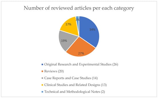 We grouped reviewed articles into the following categories: Original Research and Experimental Studies, Clinical Studies and Related Designs, Case Reports and Case Studies, Reviews, and Technical and Methodological Notes. This categorization, by clustering articles with similar goals, reflects their distinct purposes, methodologies, and contributions to the scientific field. The number of articles in each category is described in Figure 5.