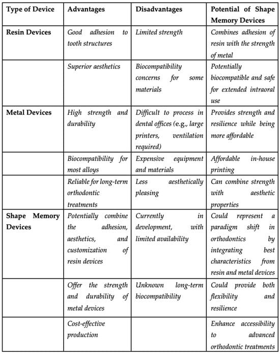 Comparison of 3D-printed resin, metal, and shape memory orthodontic devices: advantages, disadvantages, and future potential.