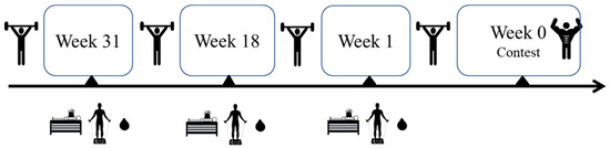 Body composition analysis was performed at the three time points of 31, 18, and 1 week before the contest.