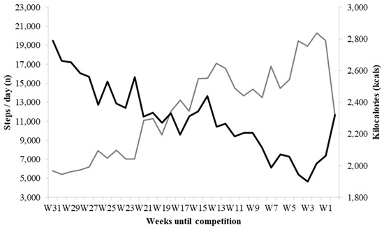 Steps per day (gray line) and kilocalories consumed per day (black line) during the 31-week preparation phase for a contest. W31 = 31 weeks before the contest; W1 = 1 week before the contest.