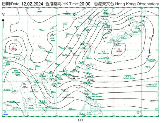 The surface isobaric chart at 12 UTC on that day (which is 20H in Hong Kong time, HKT = UTC + 8 h) is shown in Figure 1a. The chart was produced by the duty forecaster through analyzing the available surface observations. There was a broad area of high pressure to the south of Japan. An easterly ridge established itself over the southeasterly coast of China, bringing moderate easterly winds to Hong Kong near the surface. The observations from the weather stations around HKIA are shown in Figure 1b. East to southeasterly winds prevailed over the airport area. However, at higher altitudes, e.g., the mountaintops of Lantau Island, the winds reached a strong force (colored blue in Figure 1b), with a wind speed of 25 to 30 knots.