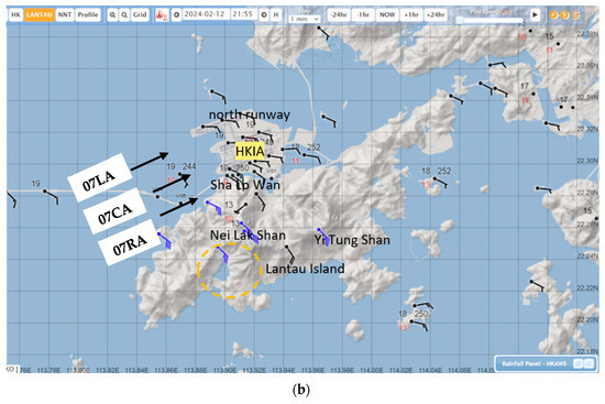 Surface isobaric chart for the 12 Feb 2024 windshear case (a) and the surface observations from nearby HKIA (b), with winds on hilltops enclosed by the ellipse in orange. The landing runways 07LA, 07CA, and 07RA are shown in (b). The grid in (b) has a size of 0.02 degrees, i.e., around 2 kilometers. For all maps used in this communication, the top of map is the north, as indicated in (a). All the figures are north–south oriented.