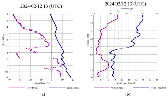 Radiosonde ascent. The upper plot (a) is temperature and dew point, and (b) is wind speed and direction.