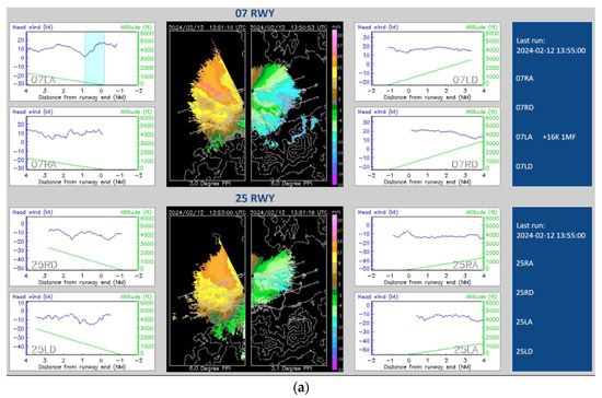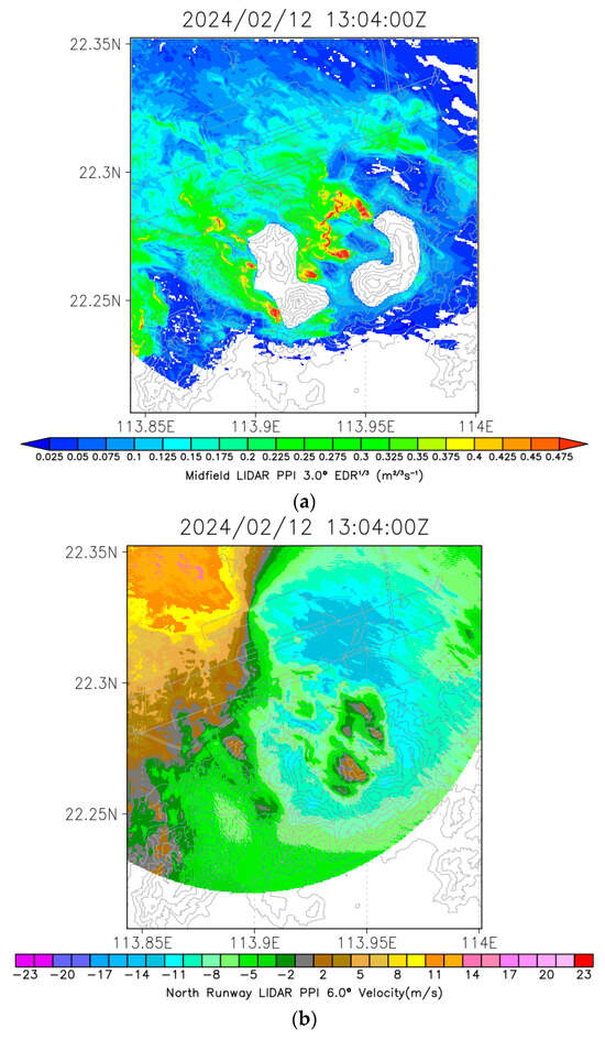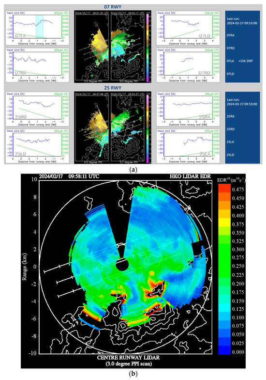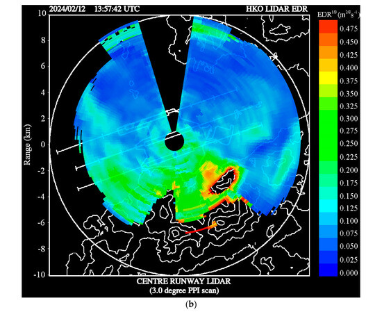 LIDAR observations are shown in Figure 3. Figure 3a shows the standard panel of the glide path scan windshear alert generation algorithm (GLYGA), with the three-degree and six-degree plan position indicator (PPI) scans of Doppler velocities from the central and northern LIDAR at HKIA shown in the middle. The panels on the far right and far left are the headwind profiles for the various runway corridors. The principles of GLYGA can be found in [10]. Significant windshear has been captured for runway corridor 07LA, with the alert shown (+16 knots at one nautical mile final) and highlighted in blue in the headwind profile. There were two windshear reports from pilots for 07LA during this event, namely, a headwind gain of 15 knots at a height of 300 feet at 13:55 UTC and a headwind gain of 15 knots at a height of 100 to 300 feet at 14:04 UTC. They were both captured by GLYGA, and the GLYGA alerts were consistent with the pilot reports of windshear. Figure 3b shows the eddy dissipation rate (EDR) plot from the three-degree PPI of the central LIDAR around that time. The EDR map was generated according to the method described in [16]. Moderate turbulence (around 0.3, colored green in Figure 3b) shows up between the runway end and 1 nautical mile away for 07LA.