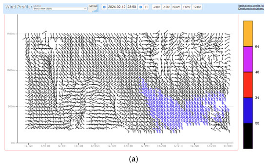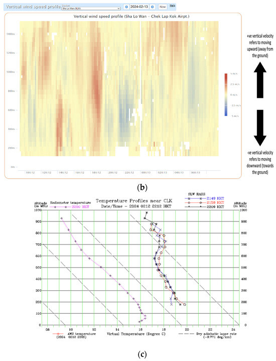 The Sha Lo Wan wind profiler/RASS data are shown in Figure 12. At around 10 UTC (18H), slightly stronger winds were observed below 500 m above mean sea level (Figure 12a), with strong upward motion (in red, about 4–5 m/s, Figure 12b). The virtual temperature was mostly constant up to that height and dropped gradually at higher altitudes (Figure 12c).