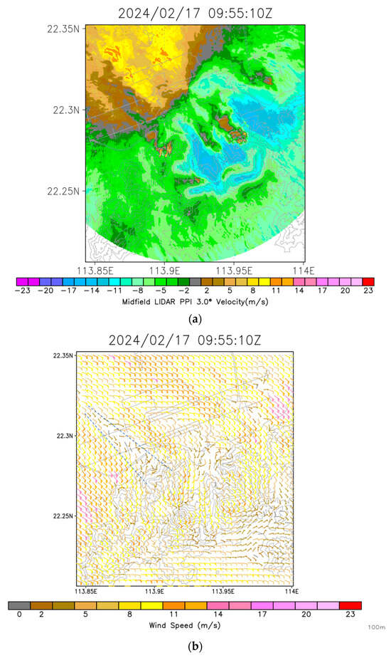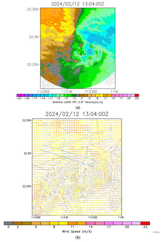 The simulated LIDAR velocity image (a) and wind at a height of around 100 m above sea level (b) for the 17 February 2024 windshear case. The wake of Nei Lak Shan is between the two broken straight lines in (b). All the figures are north–south oriented.