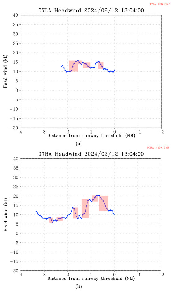 Graph (a,b) are the simulated headwind profiles and detected windshear (marked by pink boxes) for 07LA and 07RA, respectively, for the windshear case of 12 February 2024.