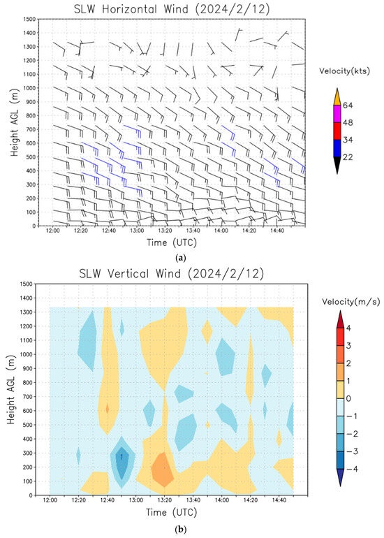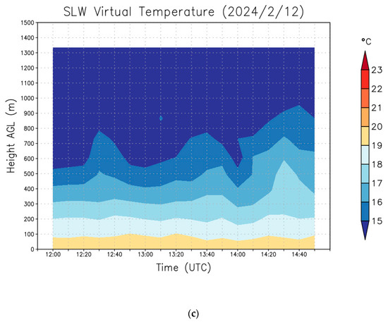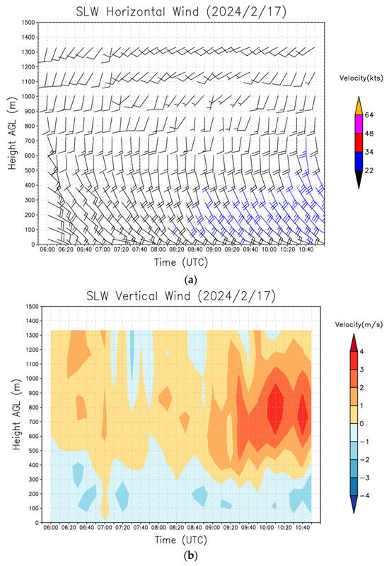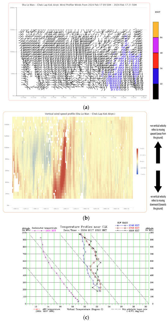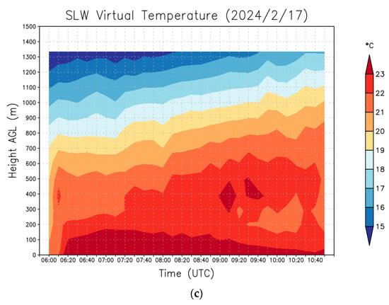 The time–height cross section of wind (a) and vertical velocity (b) for the 17 February 2024 windshear case; (c) shows selected virtual temperature profiles.