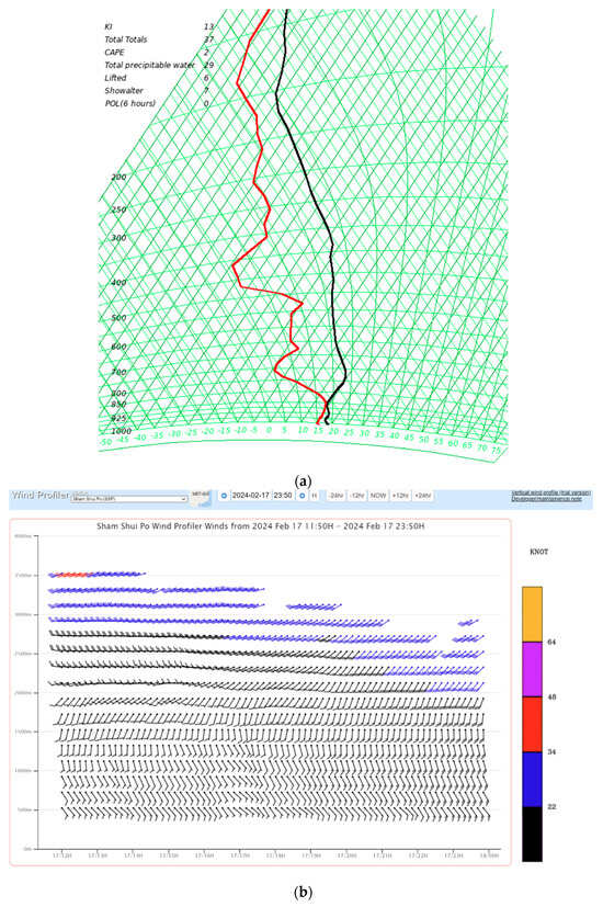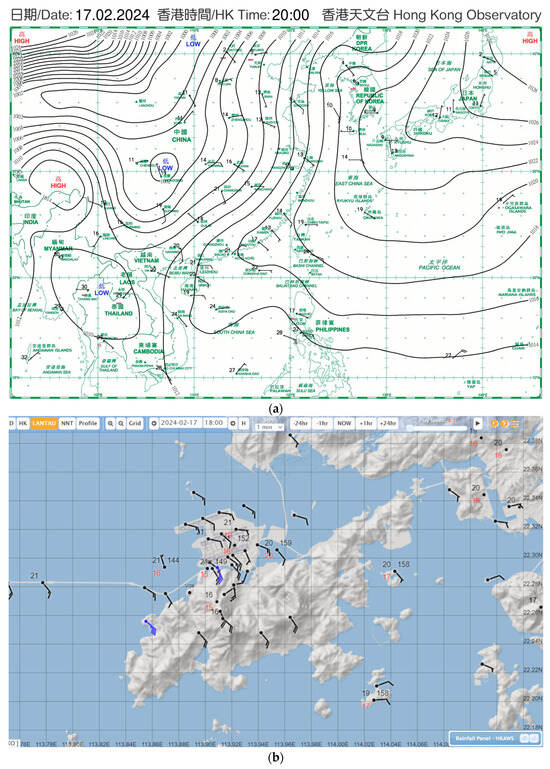 Synoptic weather pattern (a) and observations near HKIA (b) for the 17 February 2024 windshear case. All the figures are north–south oriented.
